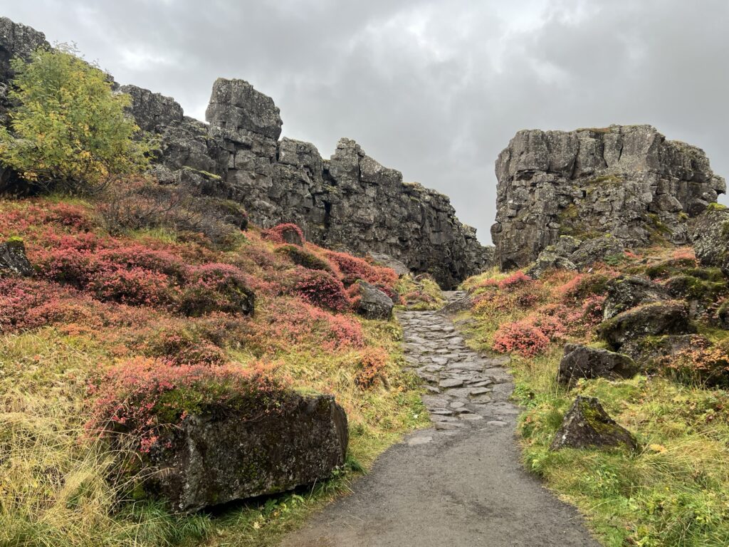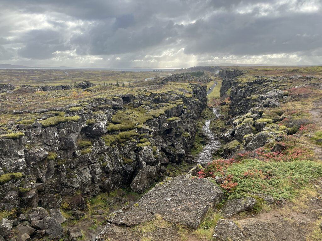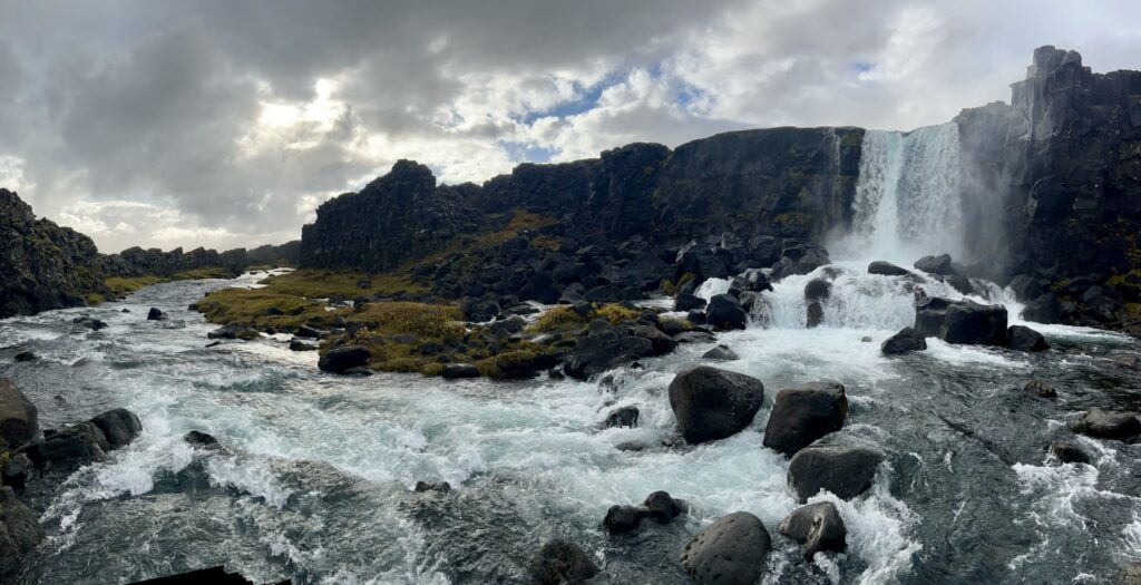 Stattdessen ging es am frühen Nachmittag bei nachlassendem Regen zum ersten Stopp am Thingvellir Nationalpark, wo im Jahr 930 das isländische Parlament seinen Ursprung fand. Beeindruckend ist hier die Landschaft entlang des tektonischen Graben zwischen der nordamerikanischen und eurasischen Kontinentalplatte, und mit dem Öxarafoss konnten wir jetzt den ersten der vielen Wasserfälle in Island erleben.