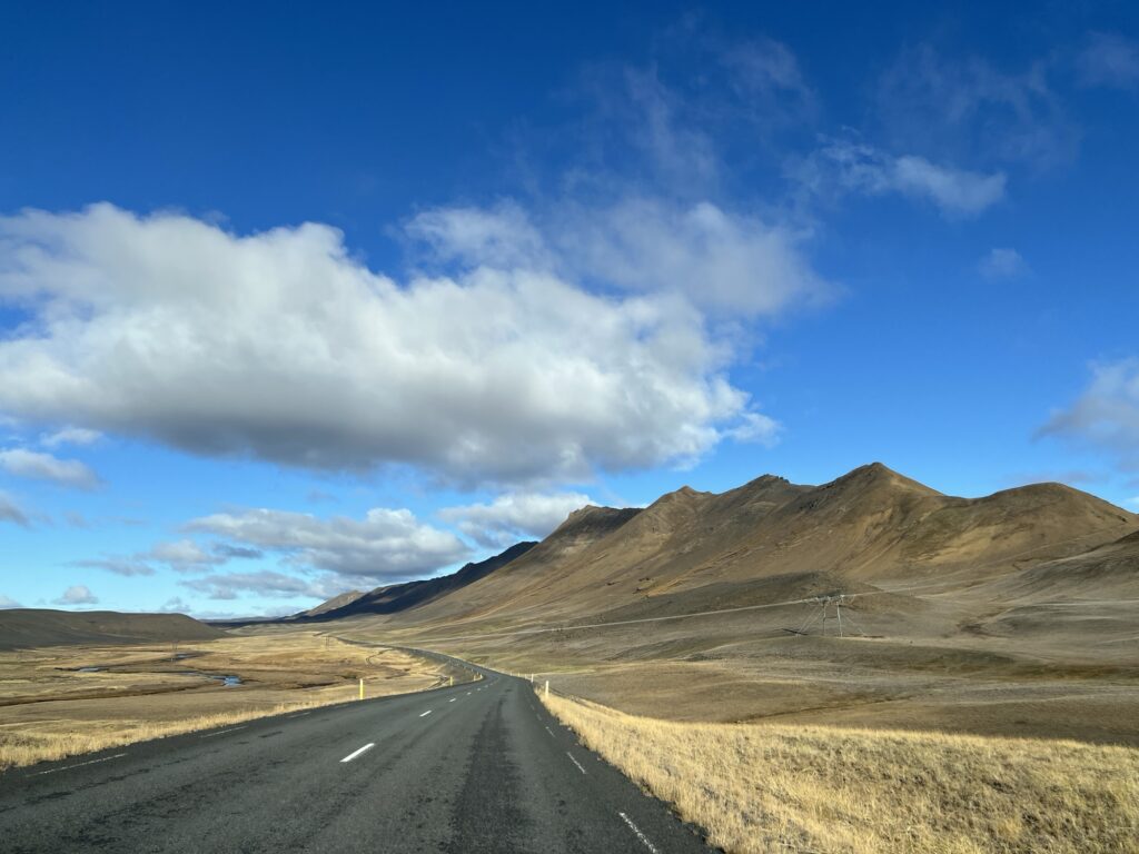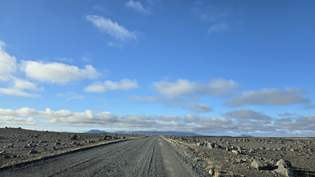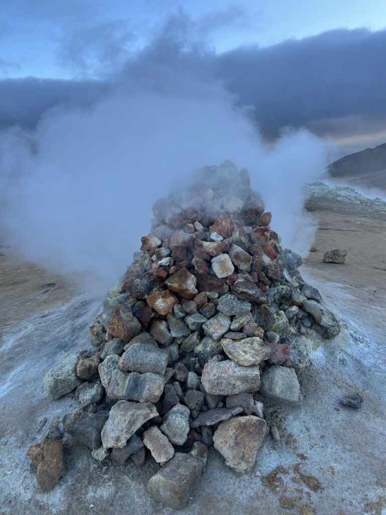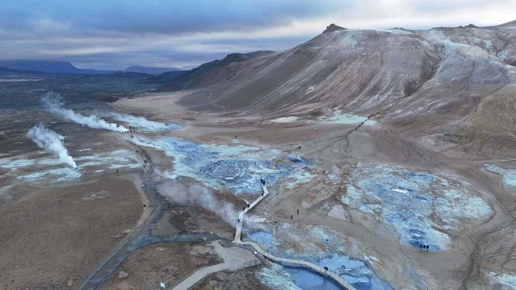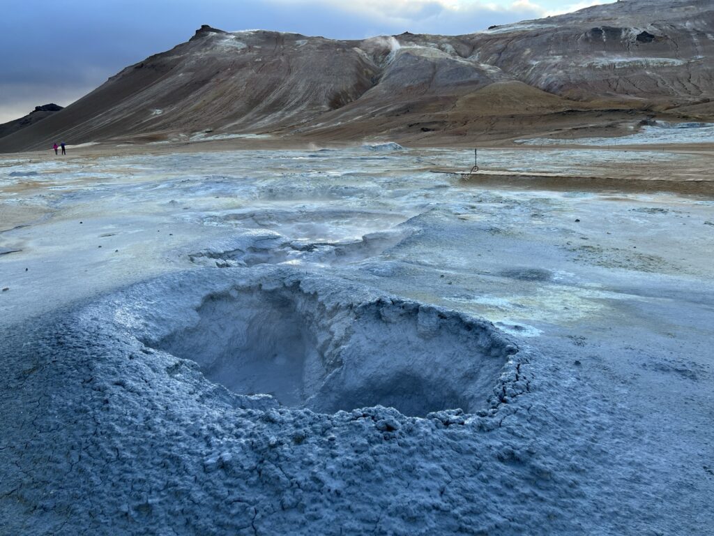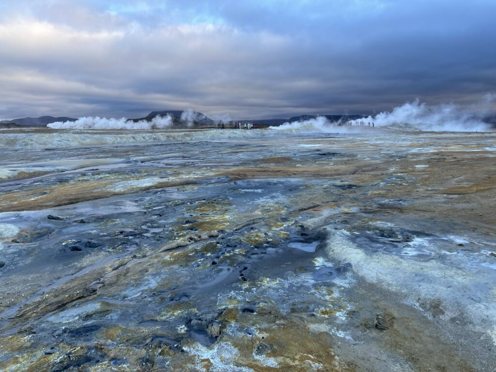 Inzwischen hatte sich die Bewölkung zugezogen und die Sonne war verschwunden, so dass wir erst wieder die 30km zurück über die Schotterpiste und dann weiter über die Ringstrasse durch die dann eher triste Landschaft fuhren. Kurz vor dem Myvatn See und unserer Unterkunft dort gab es aber noch ein Highlight: im geothermischen Gebiet von Hrevir blubberte, qualmte und stank es aus vielen kleineren und grösseren Löchern im Boden.