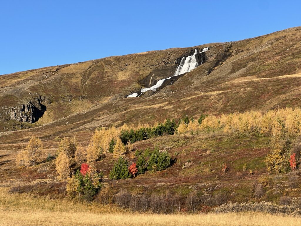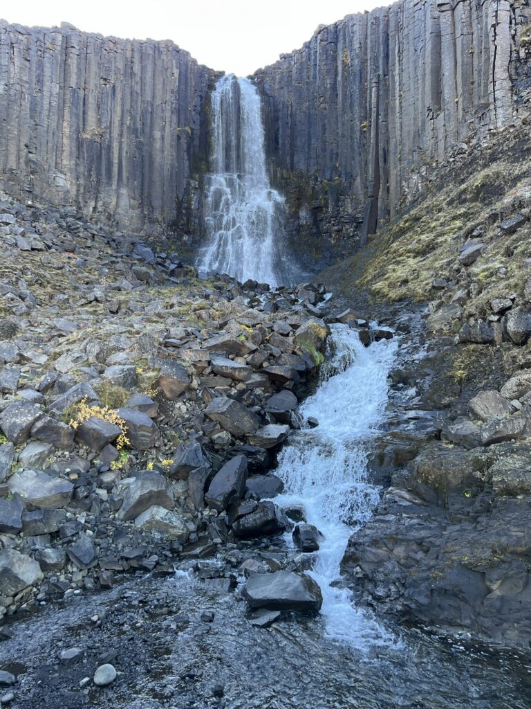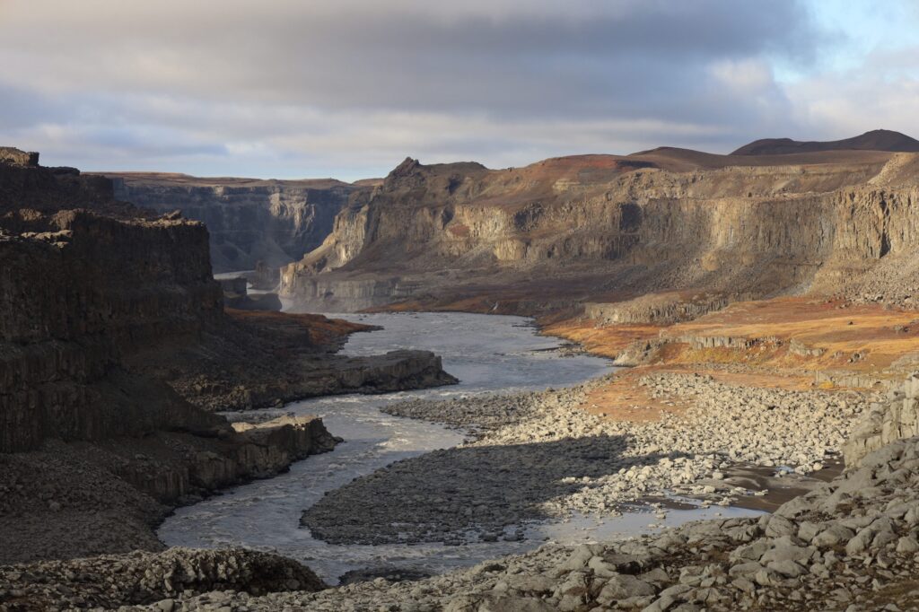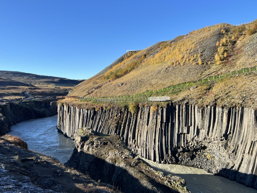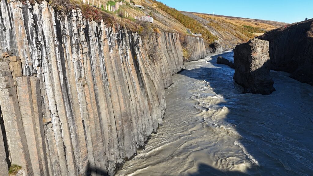 Die erste Aktivität des Tages führte uns zum Stuðlagil Canyon. DIe Zielführung mit Google Maps führte uns zum Parkplatz und den Aussichtsplatformen auf der Westseite, aber da die Sonne noch tief im Osten stand lag die gegenüberliegende Seite des Canyons im Schatten. Stattdessen sind wir zurück zu einem Abzweig vorher, wo man über eine Brücke zu einem Parkplatz auf der Ostseite fahren konnte. Zwar muss man von hier etwa 2,5 km laufen, kommt aber so auch am Stuðlafoss Wasserfall vorbei.