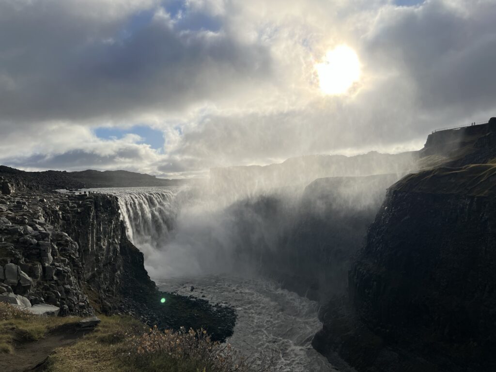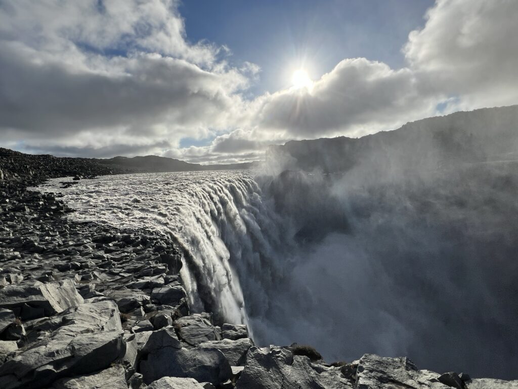 Der nächste Streckenabschnitt führte uns weiter nach Nordwesten zum Dettifoss Wasserfall. Nach angenehmer Fahrt auf der Ringstrasse bei immer noch schönstem Wetter wurde es dann anstrengender, denn wir hatten uns für die Schotterpiste zur Ostseite des grössten Wasserfalls in Europa entschieden. Die Zufahrt zur Westseite wäre wohl einfacher gewesen, aber sollte dementsprechend voller sein und nicht ganz so gute Sicht bieten. Nach 30km Fahrt über Schlaglöcher und Wellen in der Strasse konnten wir dann endlich nicht nur den beeindruckenden Blick auf den Wasserfall sondern auch die Schlucht davor geniessen.