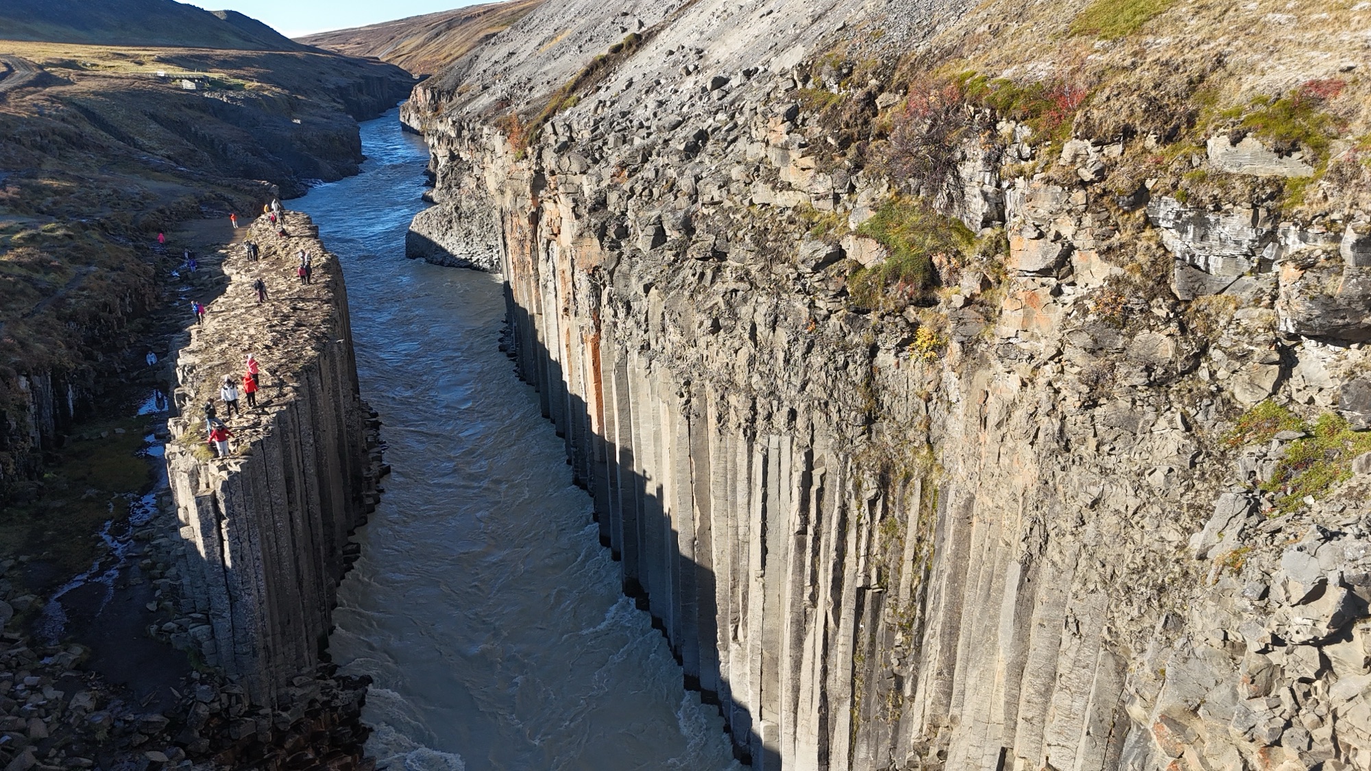Die erste Aktivität des Tages führte uns zum Stuðlagil Canyon. DIe Zielführung mit Google Maps führte uns zum Parkplatz und den Aussichtsplatformen auf der Westseite, aber da die Sonne noch tief im Osten stand lag die gegenüberliegende Seite des Canyons im Schatten. Stattdessen sind wir zurück zu einem Abzweig vorher, wo man über eine Brücke zu einem Parkplatz auf der Ostseite fahren konnte. Zwar muss man von hier etwa 2,5 km laufen, kommt aber so auch am Stuðlafoss Wasserfall vorbei.