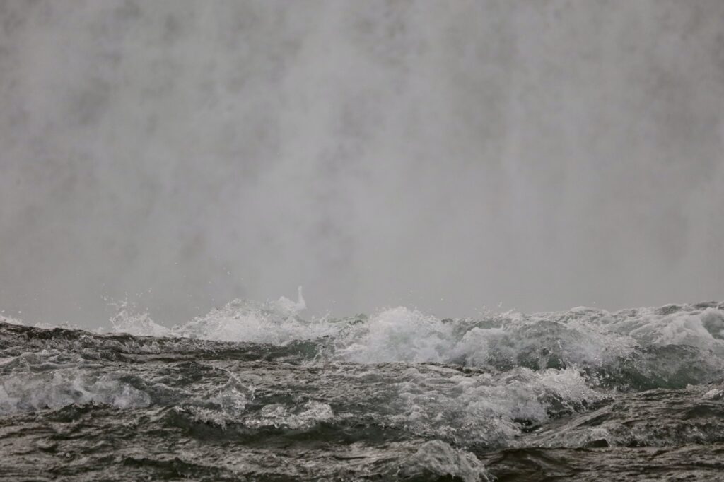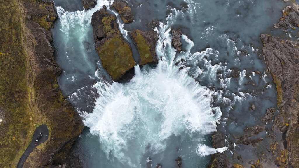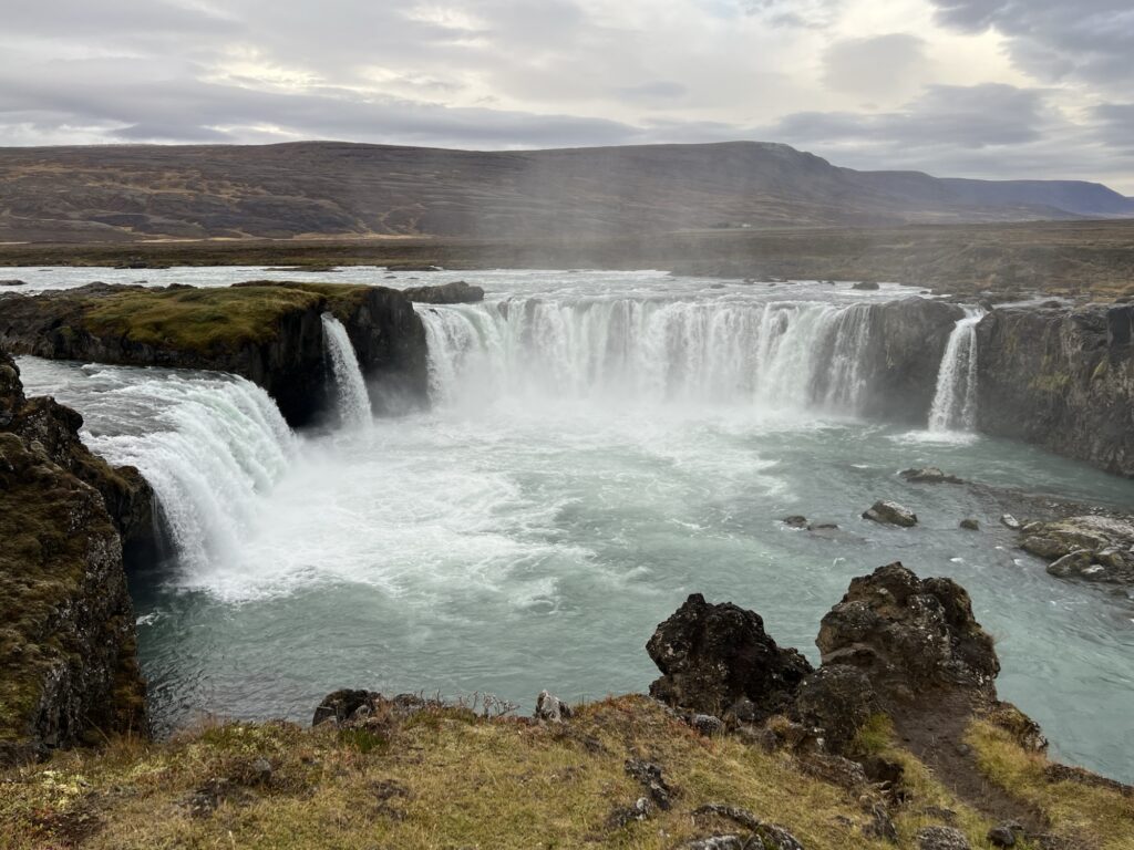 Husavik ist eigentlich bekannt für die Möglichkeit, Wale zu sehen, auch wenn der Oktober schon nicht mehr in der Hauptsaison liegt. Wir hatten nicht vorgebucht und am Abend die Wettervorhersage angeschaut: es sollte noch am Vormittag regnen und es wäre ziemlich ungemütlich geworden, daher haben wir uns gegen eine Bootstour entschieden. Stattdessen sind wir noch früh am Morgen im Sonnenschein zum Godafoss gefahren, dem „Wasserfall der Götter“. Hier hatte die Bewölkung schon zugenommen aber der Regen kam dann erst nach unserem Besuch dort (allerdings weniger als erwartet). Den Wasserfall kann man auf beiden Seiten von einen Parkplatz gut erreichen, und nach dem Blick von oben habe ich erst auf dem Rückweg das winzige Schild mit dem Drohnenverbot gesehen 😀.