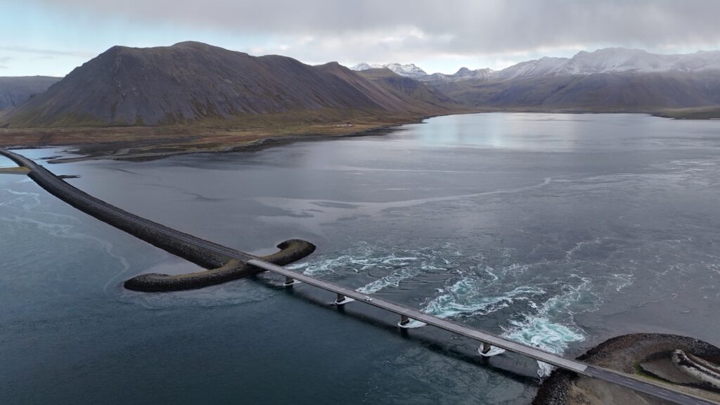 Die Strasse 54 führte dann viele Kilometer über Schotter entlang der Küste mit immer wieder beeindruckenden Ausblicken auf die Landschaft, und da jetzt überwiegend die Sonne schien (bis auf eine tiefhängende Wolke an der Kolgrafarfjörður Brücke) waren wir erst recht begeistert.