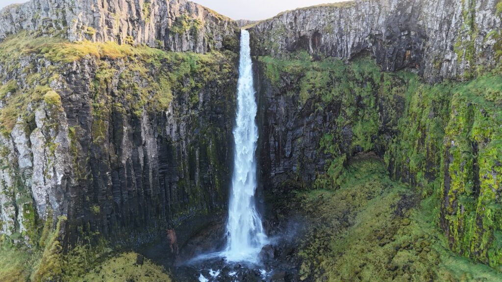 Gegen 16 Uhr stand die Sonne schon so tief dass wir weiterfahren wollten und keine Zeit mehr hatten, die 20 Minuten zum Grundarfoss zu wandern. Wie praktisch, dass die Drohne mal eben die 1300m bis zum Wasserfall fliegen konnte um ein Foto aus der Nähe zu schiessen :-).
