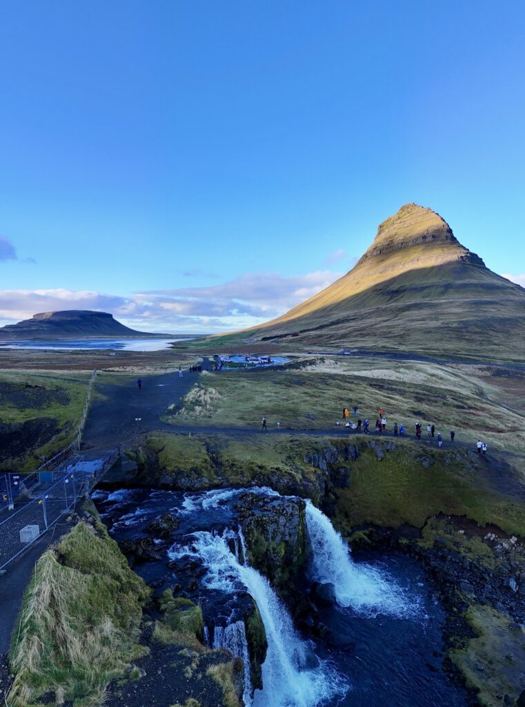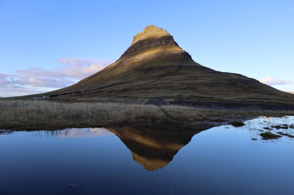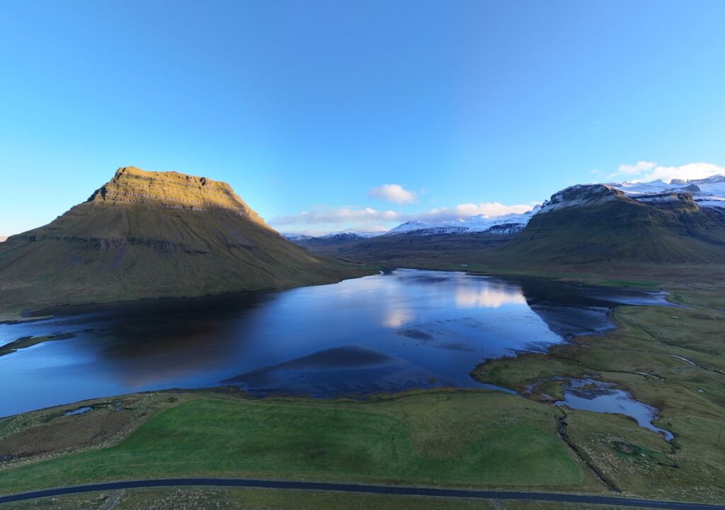 Am berühmtesten und meistfotografierten Berg Islands, dem Kirkjufell, hatte trotzdem nur noch die Bergspitze etwas Sonne abbekommen. Allerdings hätte man ohnehin nicht das klassische Motiv mit dem Kirkjufellsfoss im Vordergrund fotografieren können, denn wegen Bauarbeiten war der Weg auf die andere Seite versperrt. Die Drohne lässt sich davon aber nicht aufhalten. 🙂